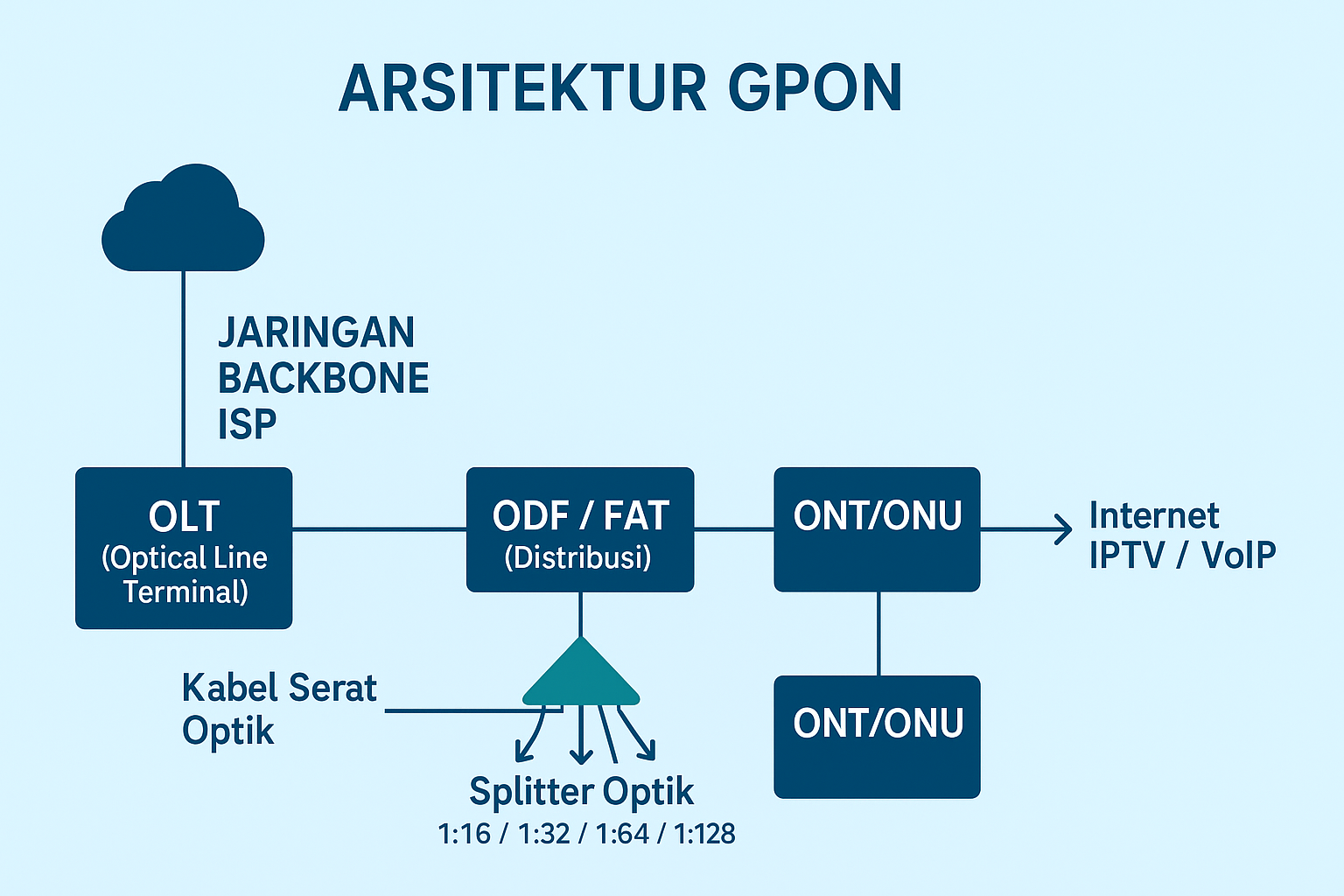 GPON adalah teknologi jaringan akses berbasis serat optik yang menggunakan konsep point-to-multipoint, di mana satu serat dari pusat dapat melayani hingga ratusan pelanggan melalui komponen pasif bernama splitter.